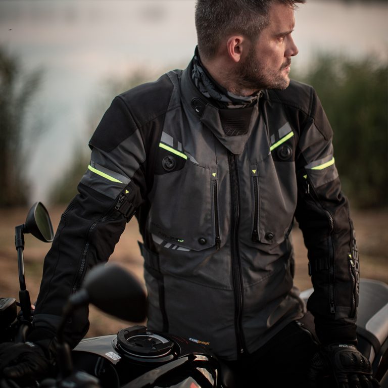 Izņemama Humax membrāna: 100 % ūdensizturīga, vēja necaurlaidīga, elpojoša Ievietojams muguras sargs Sertificēta aizsardzība EN 1621-12012 (Level 1) elkoņos un plecos Polyamid-kokvilnas mix (65% polyamide, 35% cotton)