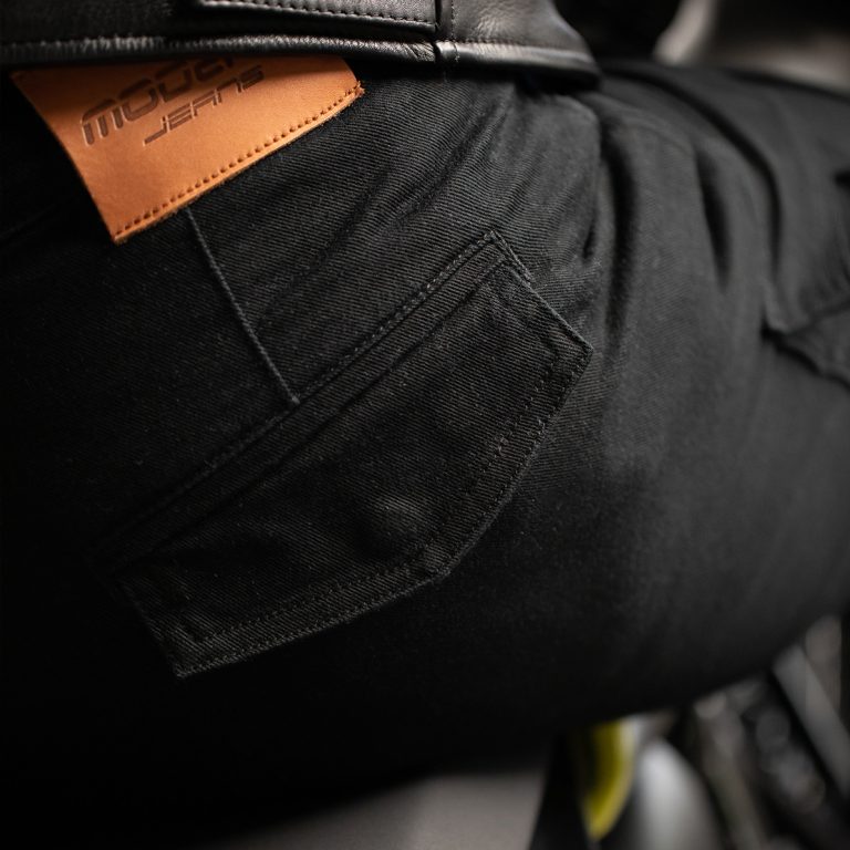 Moderna dizaina moto džinsas ar kevlāru, elastānu un paaugstinātu jostas daļu